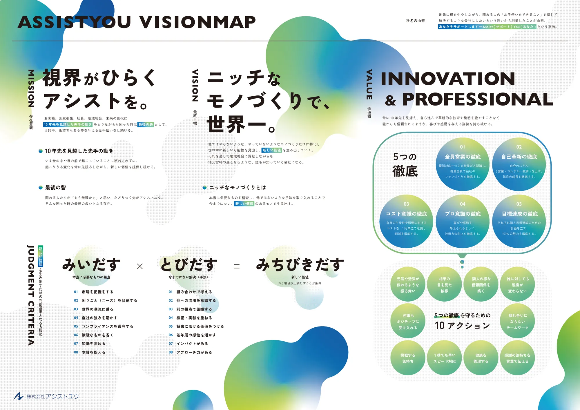 時代にマッチした商品開発を行い、国・自治体の認定・受賞・特許などを取得し、全国・世界に向け、安心安全な商品提供を行う会社として、チームアシストを掲げ社員一丸となり推し進めています。出来ることから始め世界平和を願い(SDGs)、ITソリューションアンカーとして真に実効あるソリューションを提供いたします。